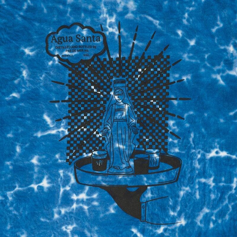 聖なる水をイメージしたようなキレイなライトブルーのタイダイ染めTシャツに、水中に沈んだようにブラックの単色でプリントされたデザインが◎です。
