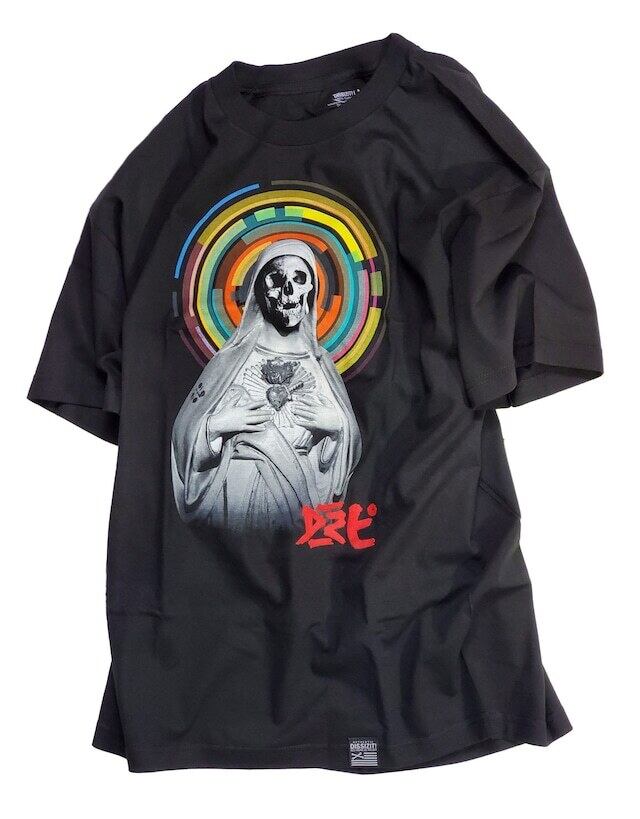 あらゆる願いを叶えてくれるとして人気を集めている死の聖母を意味するサンタ・ムエルテ(メキシコの民俗カトリック主義における女神)をプリントしたグラフィックTシャツです。