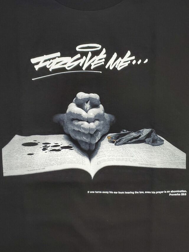 本の上で手を合わせ許しを請う意味深なフォトプリントTシャツです。