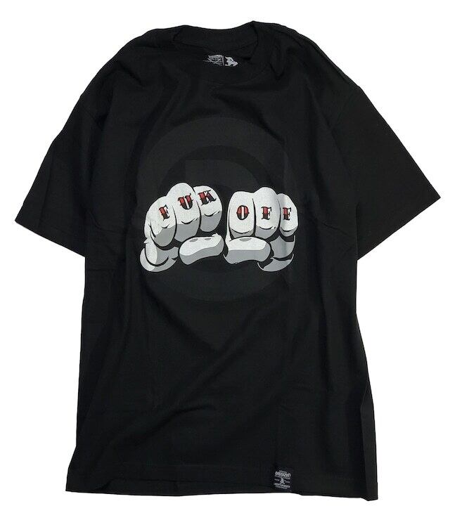 拳に”FUK OFF”のタトゥーとバックに同系色のDロゴをプリントしたグラフィックTシャツです。