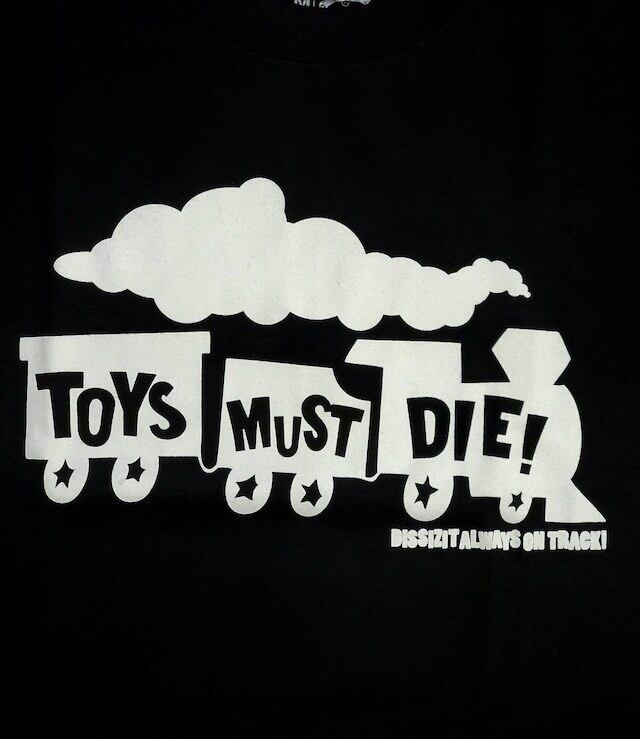 フロントに汽車のおもちゃ、肩にブランドロゴをプリントしたグラフィックTシャツです。