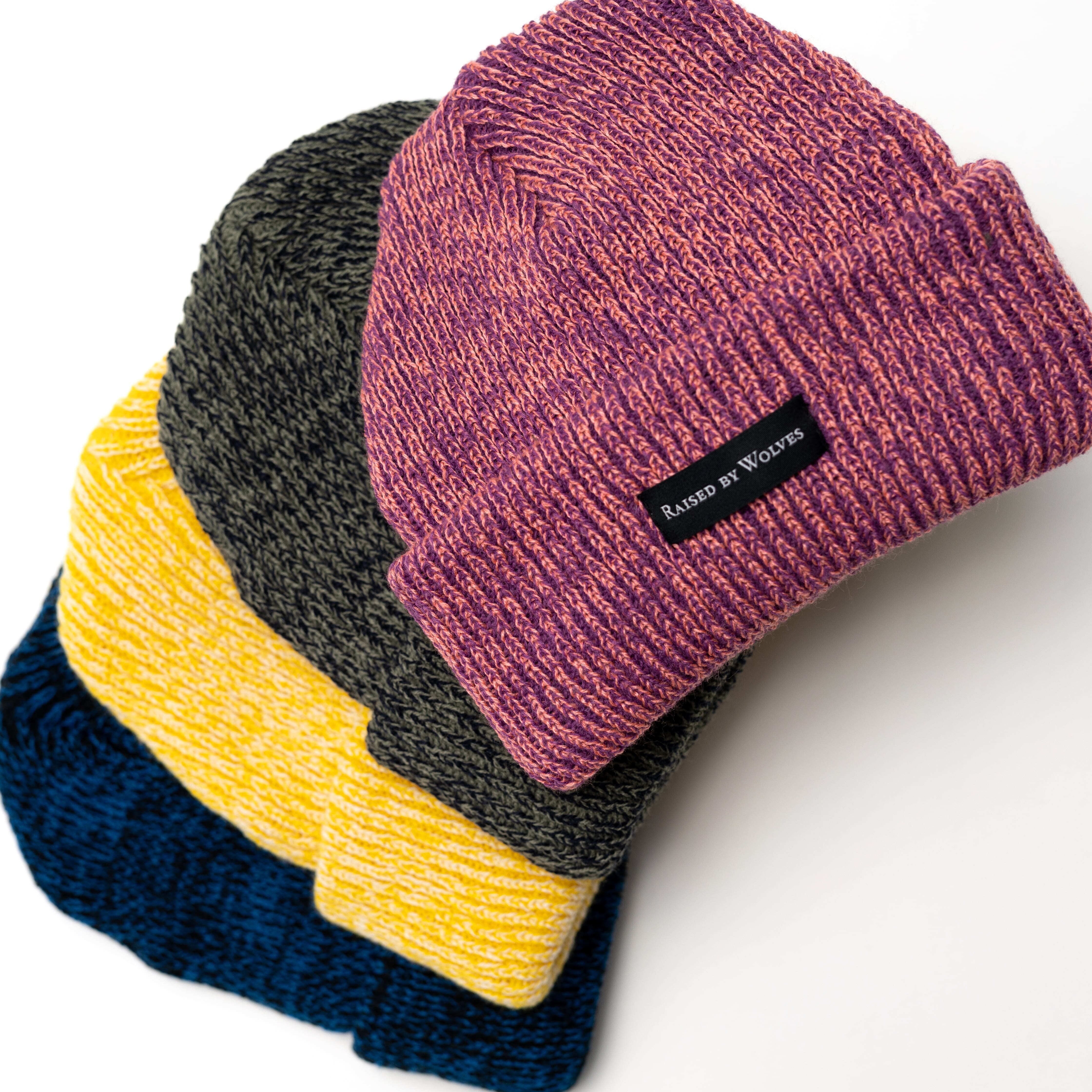 マーブル模様のアクリル素材のビーニーにウーブンラベルが付いています。